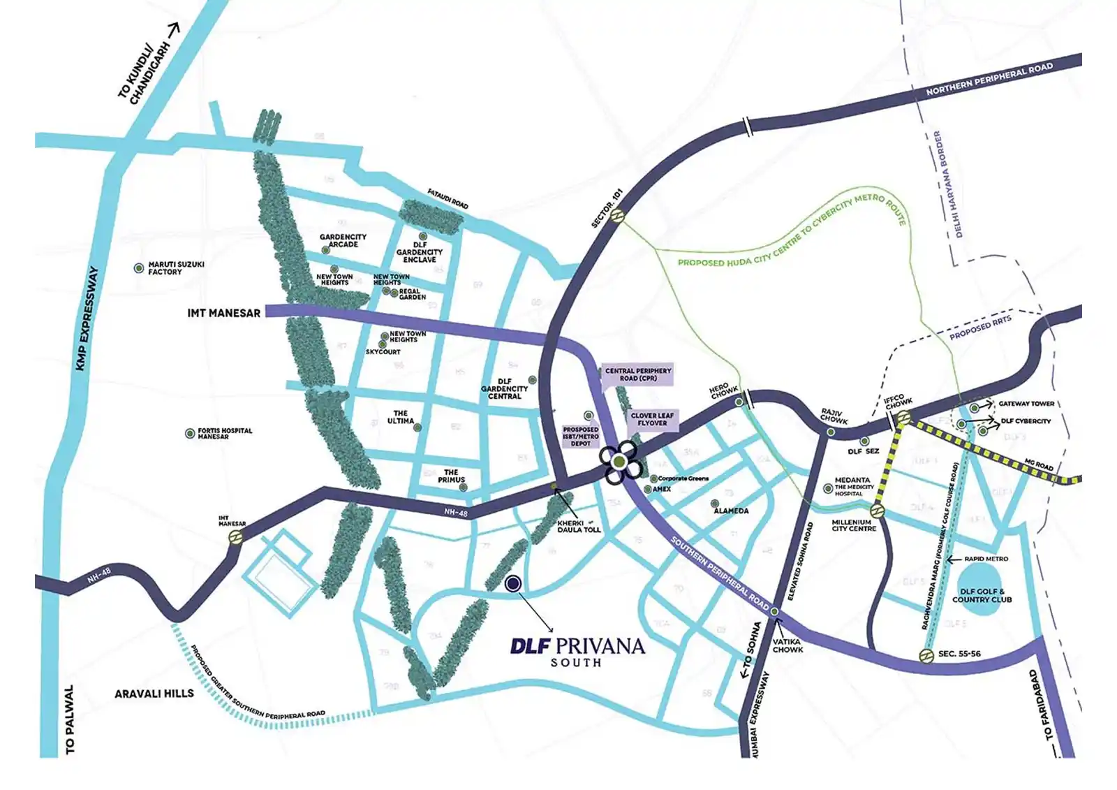 DLF Privana West Gurgaon is part of a large 116.29-acre integrated township. It is close to the Aravalli hills and a 500-meter-wide reserved green area, offering beautiful views and fresh air. Moreover, It is directly accessible via two wide roads — a 60-meter sector road and a 24-meter circulation road.