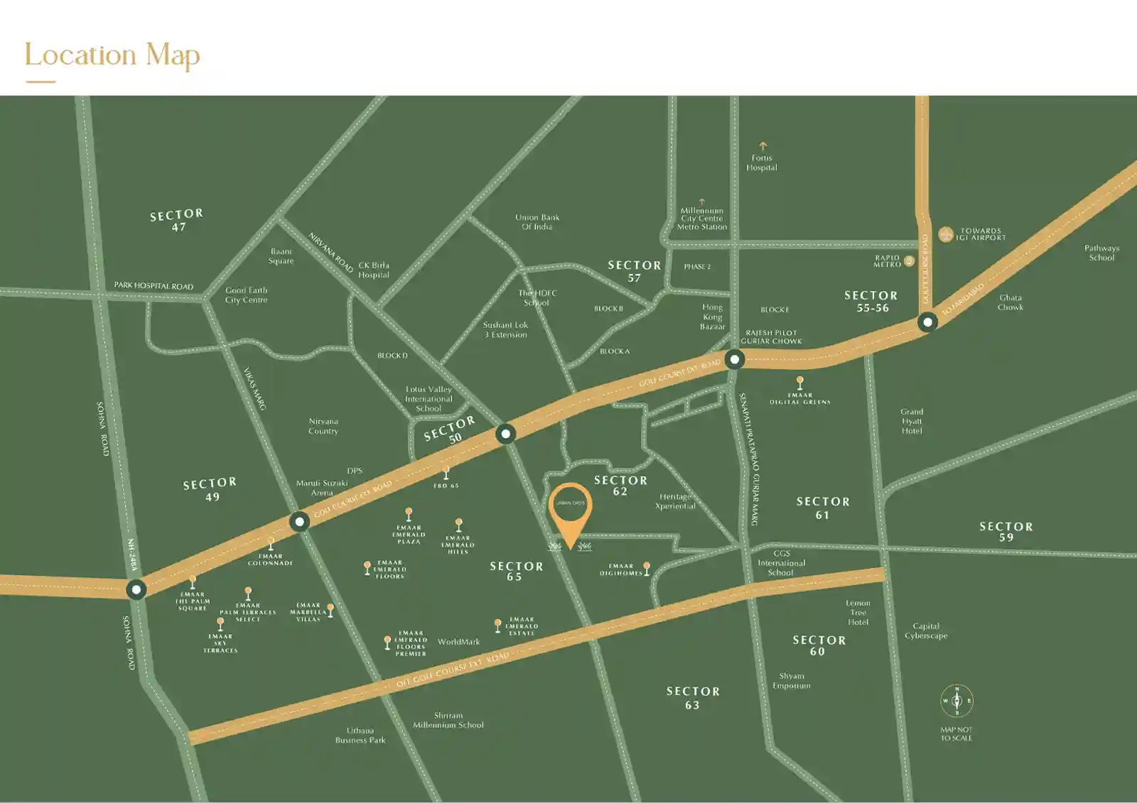 Emaar Urban Oasis is just off Golf Course Extension Road in Sector 62, Gurgaon – one of the city's most rapidly developing and upscale areas. The project enjoys seamless connectivity to key routes, including NH-8, Sohna Road, Dwarka Expressway, and Golf Course Extension Road.