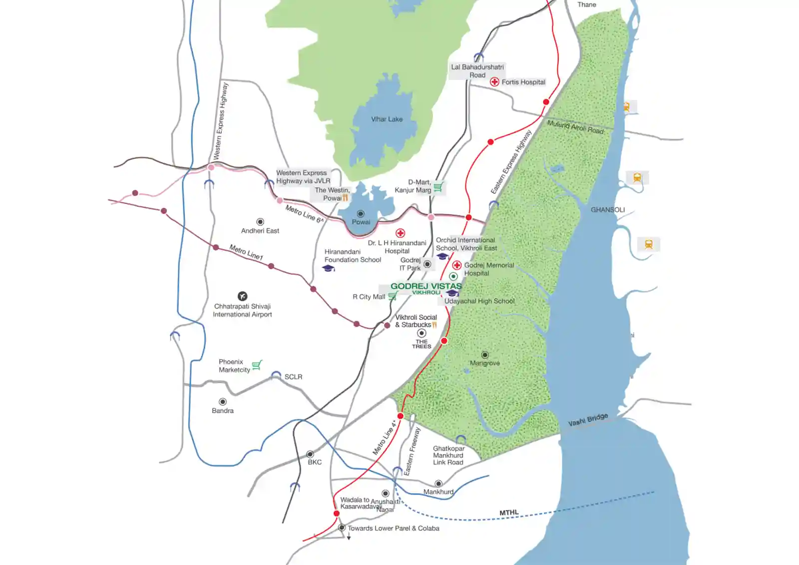 At Godrej Vistas, you can enjoy a calm and peaceful life in Vikhroli, close to the Eastern Express Highway. This green part of Mumbai keeps you well-connected to the whole city. Living here also gives you many location advantages, such as: