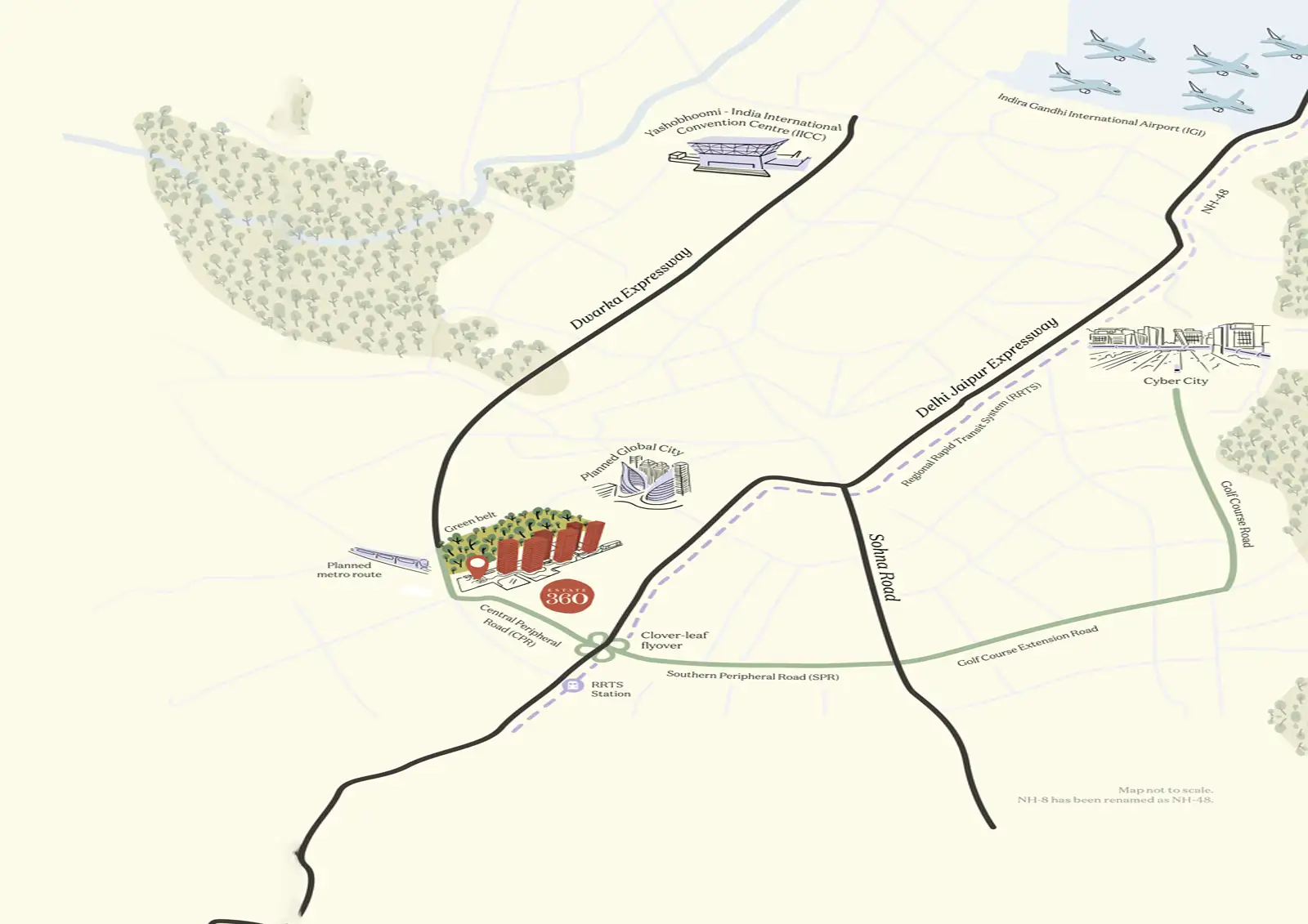 Max Estate 360 Gurgaon is located near the Dwarka Expressway, the proposed Delhi Metro corridor, and major roads like CPR, SPR, and NH-8, offering excellent connectivity to Delhi, Gurgaon, and IGI Airport.