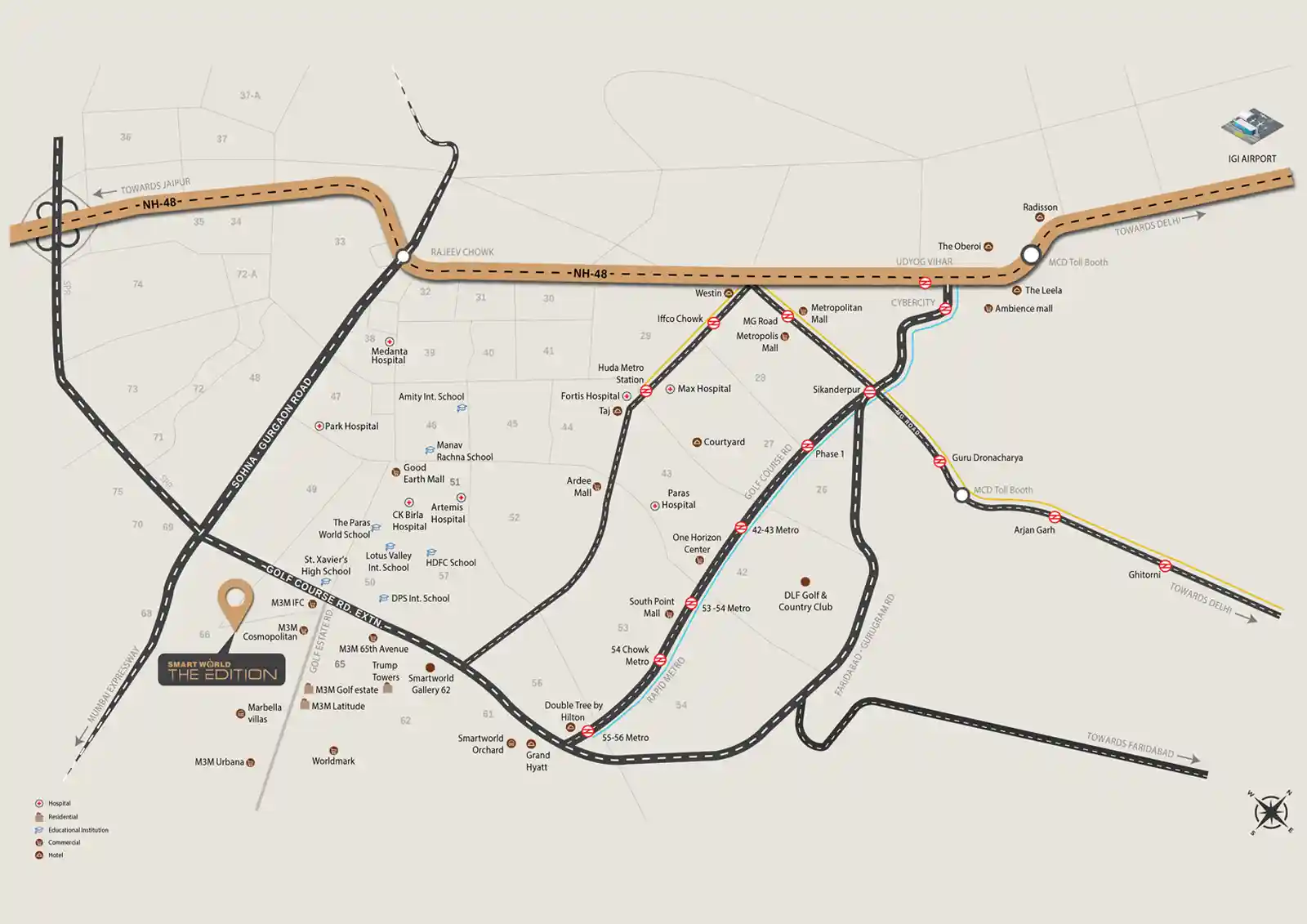 Located on Golf Course Extension Road, Smart World The Edition Sector 66 Gurgaon offers excellent connectivity to major locations. The project enjoys seamless access to Sohna Road, NH-8, and the Southern Peripheral Road (SPR). The proximity to Rapid Metro and Huda City Metro Station further enhances connectivity, making commuting easy for residents.